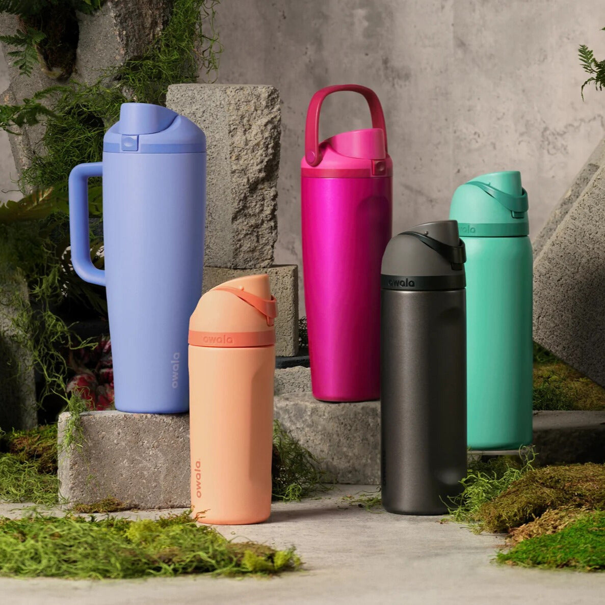 Owala lanza sus nuevos colores: Out of the Blue, Read My Lips, Peach of Mind y 90s Kid, disponibles en diferentes tamaños.